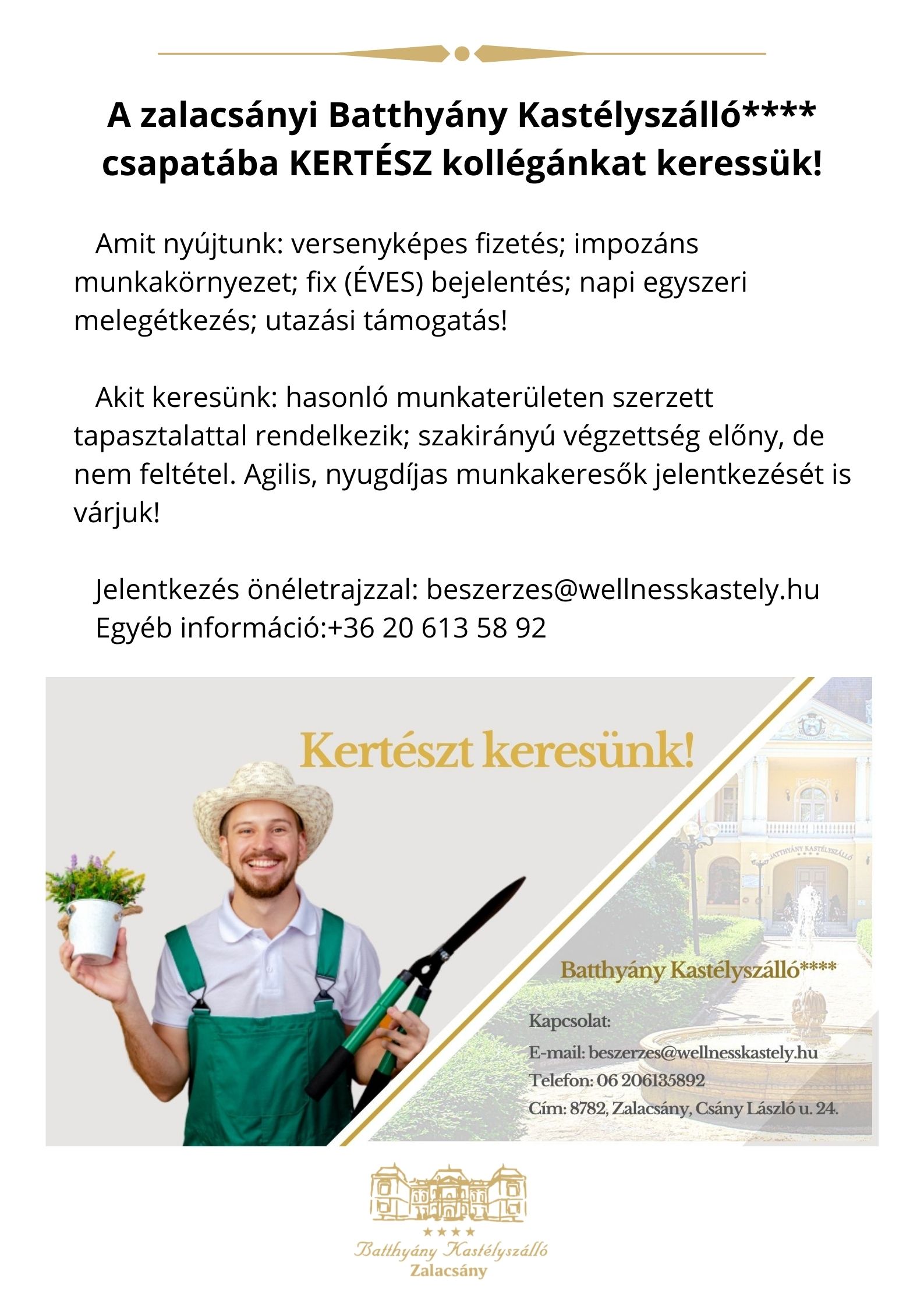 Zalacsányi Batthyány Kastélyszálló**** csapatába KERTÉSZ kollégát keres.
