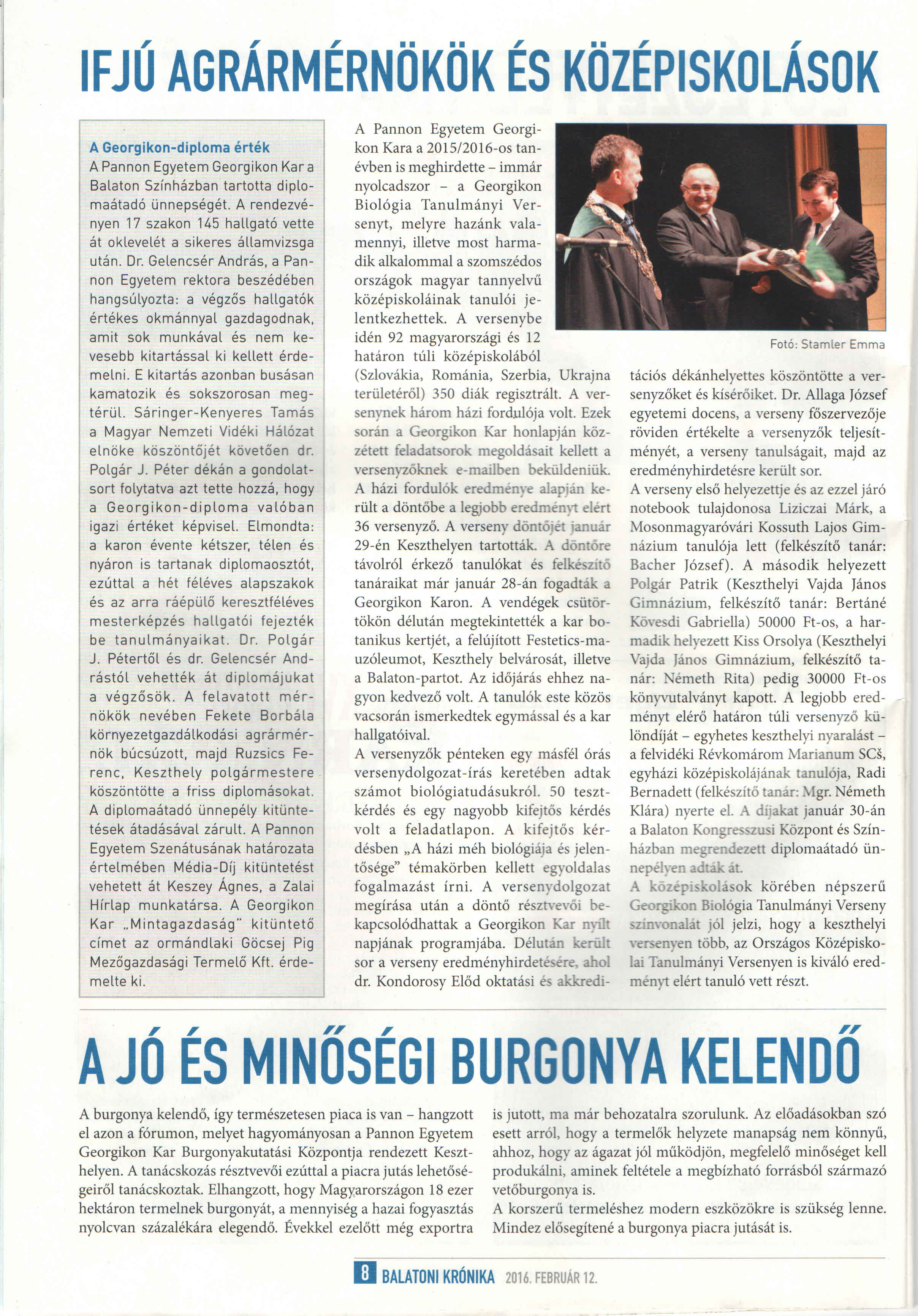 A Pannon Egyetem Georgikon Kara a 2015/2016-os tanévben is meghirdette – immár nyolcadszor – a Georgikon Biológia Tanulmányi Versenyt, melyre hazánk valamennyi, illetve most harmadik alkalommal a szomszédos országok magyar tannyelvű középiskoláinak tanulói jelentkezhettek. A versenybe idén 92 magyarországi és 12 határon túli (Szlovákia, Románia, Szerbia, Ukrajna területéről) középiskolából 350 diák regisztrált. A versenynek három házi fordulója volt. Ezek során a Georgikon Kar honlapján közzé tett feladatsorok megoldásait kellett a versenyzőknek e-mailben beküldeni. A házi fordulók eredménye alapján került a döntőbe a legjobb eredményt elért 36 versenyző. A verseny döntőjét január 29-én Keszthelyen tartották. A döntőre távolról érkező tanulókat és felkészítő tanáraikat már január 28-án fogadták a Georgikon Karon. A vendégek csütörtökön délután megtekintették a Kar botanikus kertjét, a felújított Festetics mauzóleumot, Keszthely belvárosát, illetve a Balaton-partot. Az időjárás ehhez nagyon kedvező volt. A tanulók este közös vacsorán ismerkedtek egymással és a Kar hallgatóival.
